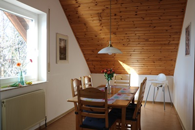 Das Wohnzimmer mit Blickrichtung Esszimmer Das Esszimmer mit Kinderhochstuhl